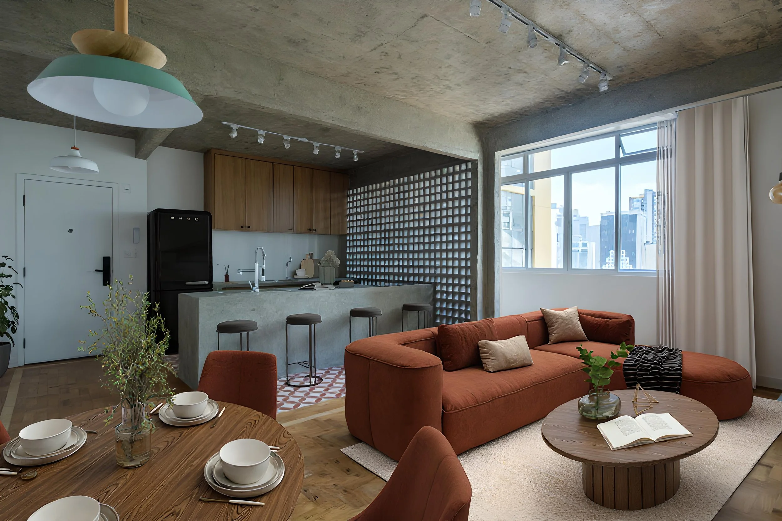Valorização dos acabamentos reais: o staging manteve o estilo original do imóvel, destacando o piso hidráulico, parede de cobogó e chão de taco.