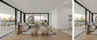 Transição de cortina simples, perfeita para comparar a imagem ambientada com a unidade real.